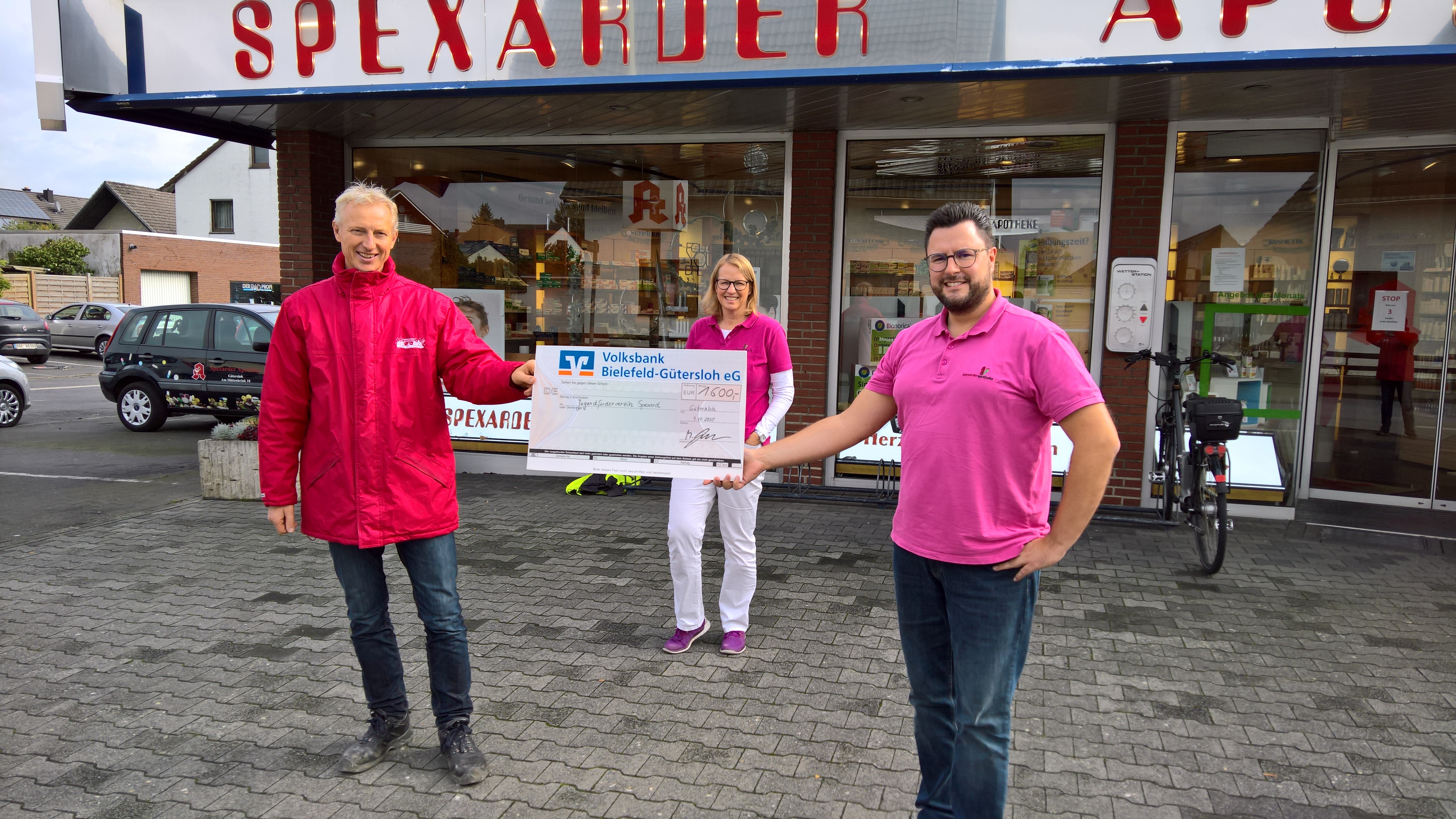 Die Spexarder Apotheke am Hüttenbrink verzichtet in diesem Jahr auf die Ausgabe von Weihnachtspräsenten und Kalendern an ihre Kunden und spendet stattdessen 1.600 Euro an den Jugendförderverein Spexard e.V., der alljährlich den Spexarder Weihnachtsmarkt zugunsten der Kinder und Jugendlichen im Ort veranstaltet. So konnten seit 2001 rund 74.000,- Euro an Kindertagesstätten, Schulen und Vereine vergeben werden. In den vergangenen Jahren wurden die Hütten für den Weihnachtsmarkt für viel Geld angemietet und mit großem Aufwand zum Spexarder Festplatz transportiert. Dies ändert sich nun, denn mit der Hilfe von Sponsoren für bereits fünf eigene Weihnachtsmarkthütten werden jährlich Kosten gespart und es steht somit mehr Geld für den guten Zweck zur Verfügung. Durch die Spende der Spexarder Apotheke kann nun eine weitere Hütte in Eigenregie gebaut werden.