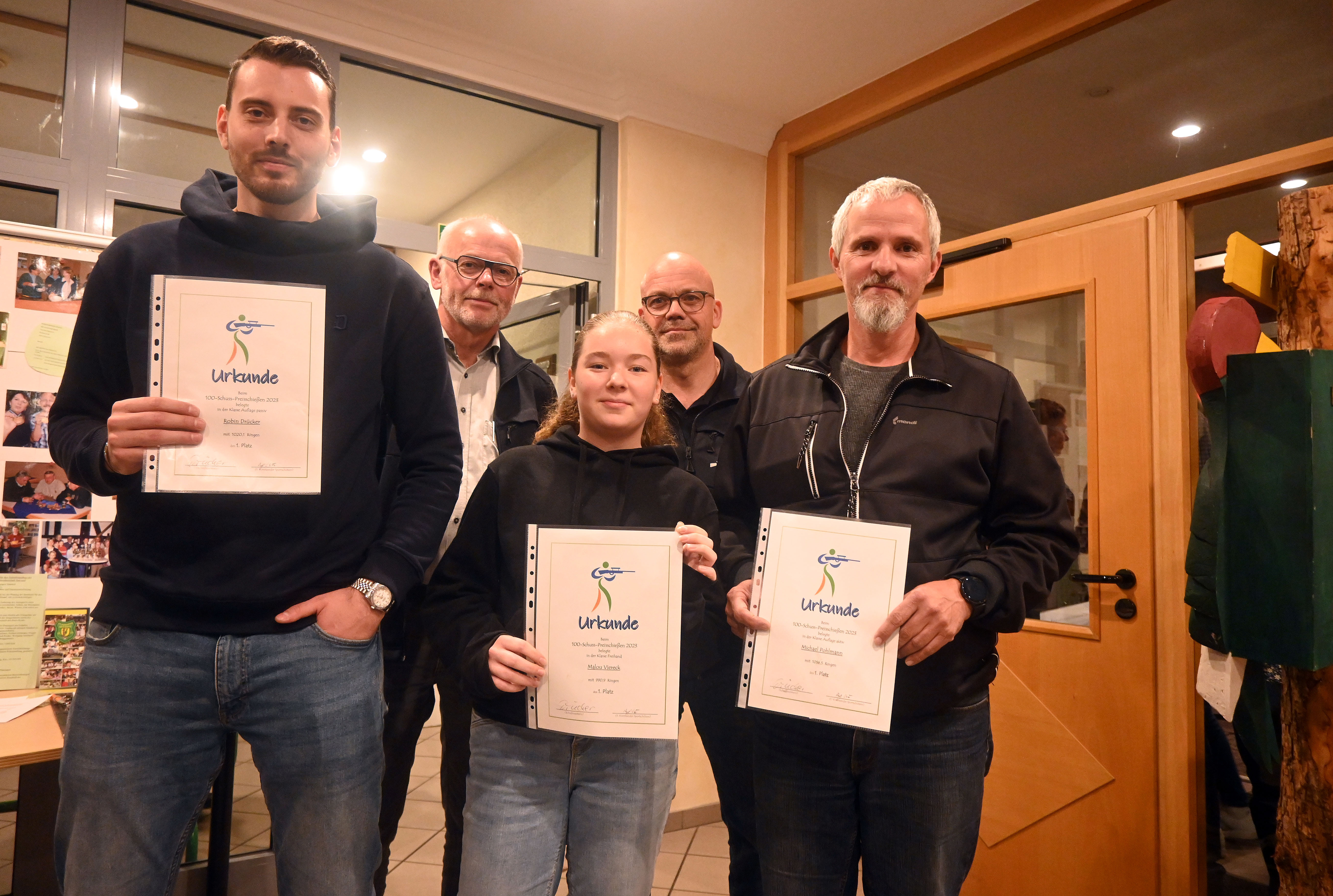 Die erfolgreichen Schützen Robin Drücker (v. v. l.), Malou Viereck und Michael Pohlmann mit dem Vorsitzenden der Sportschützen Ralf Isenbort (h.r.) und seinem Vorgänger Friedhelm Brüggemann (h.l.).