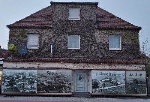Als weiteren Schritt konnte der Vorstand des Heimatvereins Die Familie Tigges als Eigentümer des Hauses an der Verler Straße 291 begeistern, die Schaufenster mit großflächigen historischen Bildern bestücken zu dürfen. Schon lange steht das Ladengeschäft dort leer. Seitdem sich der Betreiber des Tabak- und Lotto-Hauses dort verabschiedet hat, ist aus dem verschiedensten Gründen keine Nachnutzung erfolgt. Auf eigene Kosten und mit der Unterstützung einiger Nachbarn präsentiert der Heimatverein seit Anfang Mai dort unter dem Titel „Unser Spexard in alten Zeiten“ sechs großflächige Aufnahmen von Siedlungen und Straßenzügen, wie man sie früher in der Gemeinde Spexard vorfand. Im Eingangsbereich des ehemaligen Ladens werden die Bilder zusätzlich mit kurzen Texten beschrieben. Fußgänger und Radfahrer haben so die Möglichkeit, ein wenig genauer hinzuschauen und von alten Zeiten zu schwärmen. Es bleibt zu wünschen, dass auch weitere Firmen und Anwohner an der Verler Straße Projekte zur Verschönerung ihrer „Adresse“ starten.