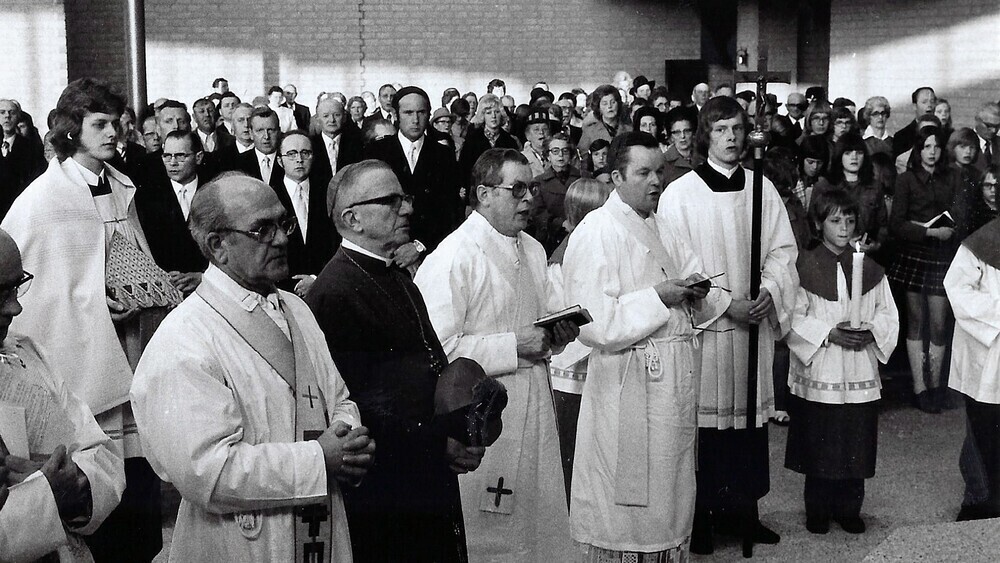 | Die Kirchweihe vor 50 Jahren. Links Pastor Josef Davits. |