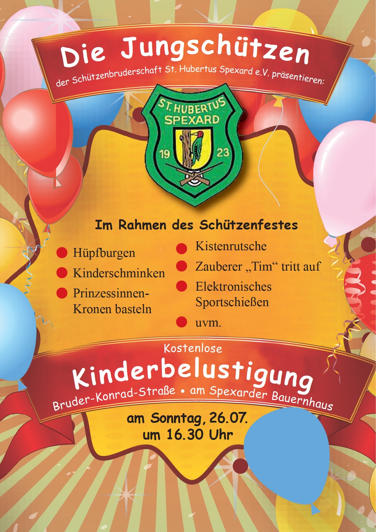 Im Rahmen des diesjährigen Schützenfestes laden Spexarder Jungschützen am Schützenfest-Sonntag (26. Juli 2015) erneut zur Kinderbelustigung neben dem Spexarder Bauernhaus ein. Ab 16:30 Uhr werden folgende kostenlose Attraktionen angeboten: