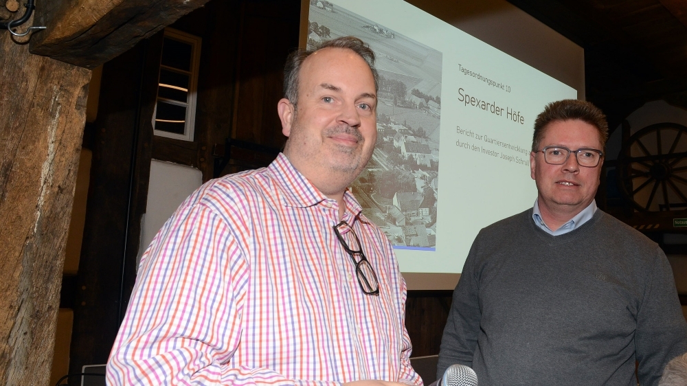 | Die Pläne zu den Spexarder Höfen stellte Joseph Schrull (links) auf Initiative von Heimatvereins-Schriftführer Christian Janzen vor. |