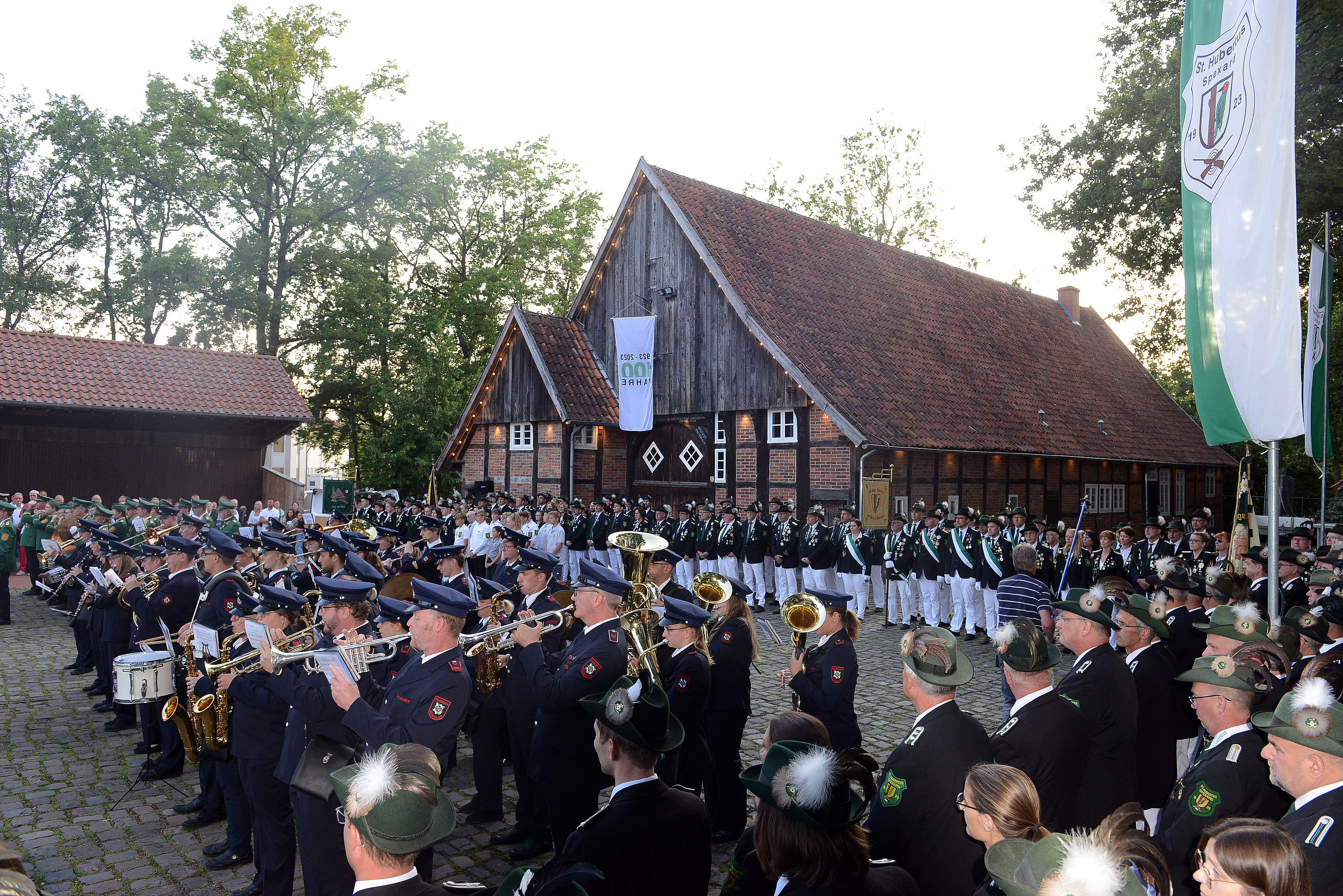 Vor dem Spexarder Bauernhaus fand der Große Zapfenstreich aus Anlass des 100. Bestehen der Schützenbruderschaft St. Hubertus Spexard statt.