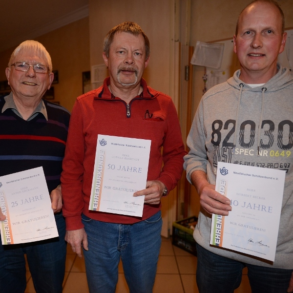 Als Sportschütze des Jahres wurde Aileen Kahlert ausgezeichnet, die im vergangenen Jahr den größten Leistungssprung der 156 Mitglieder machte. Den Orden für besondere Verdienste wurde Rene Stüker (seit 2010 Jugendleiter) und Holger Oesterwinter verliehen, die beim Umbau der Schießanlage viel Zeit investierten. Die Verdienstnadel des Westfälischen Schützenbundes für langjährige Mitgliedschaft erhielten Lars Proske, Axel Majosthusmann, Anton Löckmann, Marco Kleinelanghorst (alle 25 Jahre), Norbert Becker, Heinrich Becker (beide 40 Jahre), Norbert Winkel und Lothar Behrend (beide 50 Jahre). Beim Ranglisteschießen wurden die Sieger Rene Stüker (Auflag passiv), Renate Westhoff (Auflage aktiv), Michael Pohlmann (Freihand aktiv) und Aileen Kahlert (Freihand Jugend) ausgezeichnet.