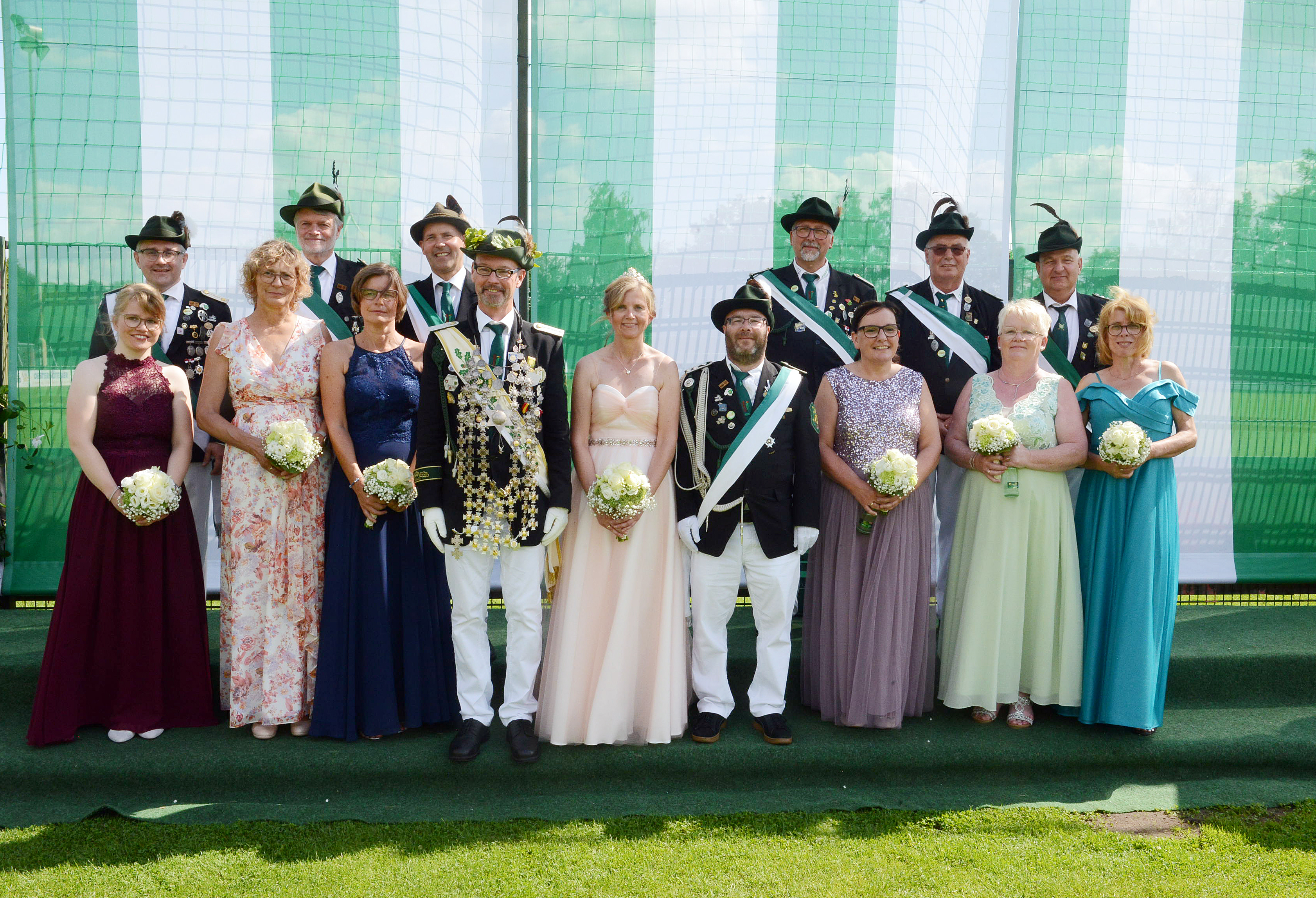 Ines Lavid und Felix Schulte (v.l.), Claudia und Ralf Hemken, Anna und Gregor Stycz, König Volker I. Stickling und Königin Daniela I. Berlin-Stickling, Adjutant Simon Hecker, David und Berit Hensdiek, Felix und Nadine Nolting sowie Oliver und Gaby Eichstädt