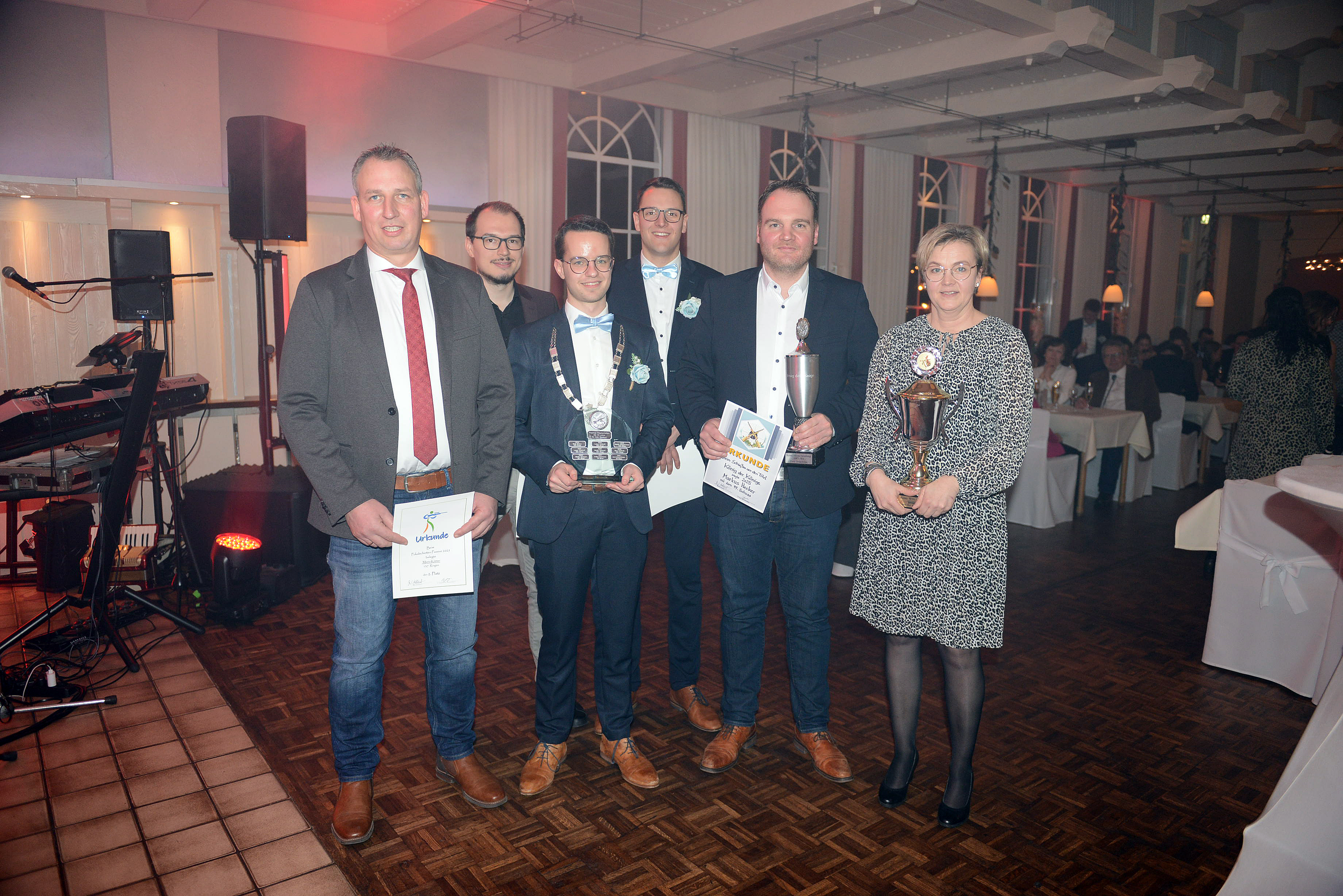 Die amtierende Majestät Dirk Fortenbacher war im 8. Anlauf endlich Schützenkönig seiner Bruderschaft geworden. Mehrfach war er der vorletzte Schütze an der Vogelstange. Die vorgesehene Throngesellschaft hatte in den Jahren immer zur Stange gehalten. Als als im vergangenen Jahr ausgerechnet am Schützenfestsamstag das vorgesehen Thronpaar Larissa und Andreas Löhner Eltern des kleinen Simon wurden, hatte Fortenbacher ein Ersatzpaar aus dem Hut gezaubert. Die Löhners, mit Wohnsitz in Mastholte, sind in der munteren Throngesellschaft akzeptiert und hatten eine Tanzgarde mitgebracht. Die Mädchen-Tanzgruppe Dance Queens aus den Reihen der Katholischen Frauengemeinschaft sorgte mit einem Auftritt für den ersten Höhepunkt des Abends. Larissa Löhner gehört zu den Trainerinnen der Karnevalstänzerinnen. Die Verleihung der Orden an die Majestäten durch Brudermeister Maik Hollenhorst gehört zu den Programmpunkten wie auch die Verleihung von Auszeichnungen. Der Sportschützenchef Ralf Isenbort übergab die Pokale an den König der Könige Markus Hecker und an die Königin der Königinnen Susanne Mitschke. Das Passiv-Schießen der Schützen ab 25 Jahren gewann Delia Spexard mit 146 Ringen bei 15 zu absolvierenden Schüssen. Der zweite Rang ging an Mario Kötter (137 Ringen) vor Sebastian Kebekus (136 Ringe). Bei den Schützen bis 25 siegte der amtierende Jungschützenkönig Lennard Stüker mit 192 Ringen bei 20 Schüssen. Zweiter wurde Jona Johannhörster (190 Ringe) vor Leon Grell (186 Ringe). Bei der üppigen Verlosung mit 20 Hauptpreisen durfte sich Malte Lucietto über ein Fahrrad freuen und 30 Liter Bier gingen an Christian Brockmann. Der Miele-Staubsauger ging an die Königin Astrid Fortenbacher. Über einen ungewöhnlichen Preis durfte sich Larissa Löhner freuen. Ein Achtel von einem Texas-Longhorn-Rind wurde von einem heimischen Züchter spendiert. Durch das Programm führte in gewohnter Art und Weise Anna Steinkamp. Die Organisation lag in den Händen von Heinz Krebs und Christian Barkusky und den fleißigen Helfern der gesamtem Bruderschaft.