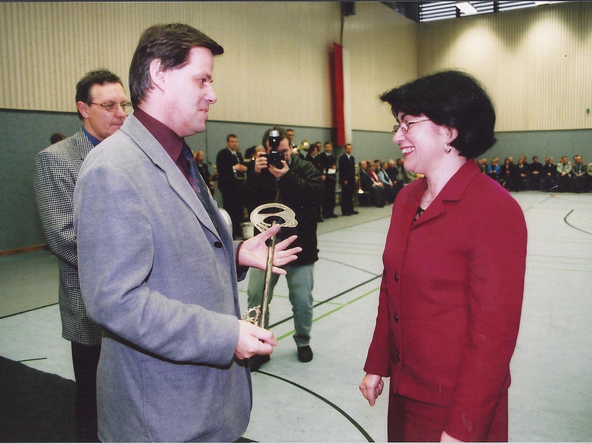| Bürgermeisterin Maria Unger übergibt den symbolischen Schlüssel der Halle an den damaligen Vorsitzenden des SV Spexard, Franz Spexard. |