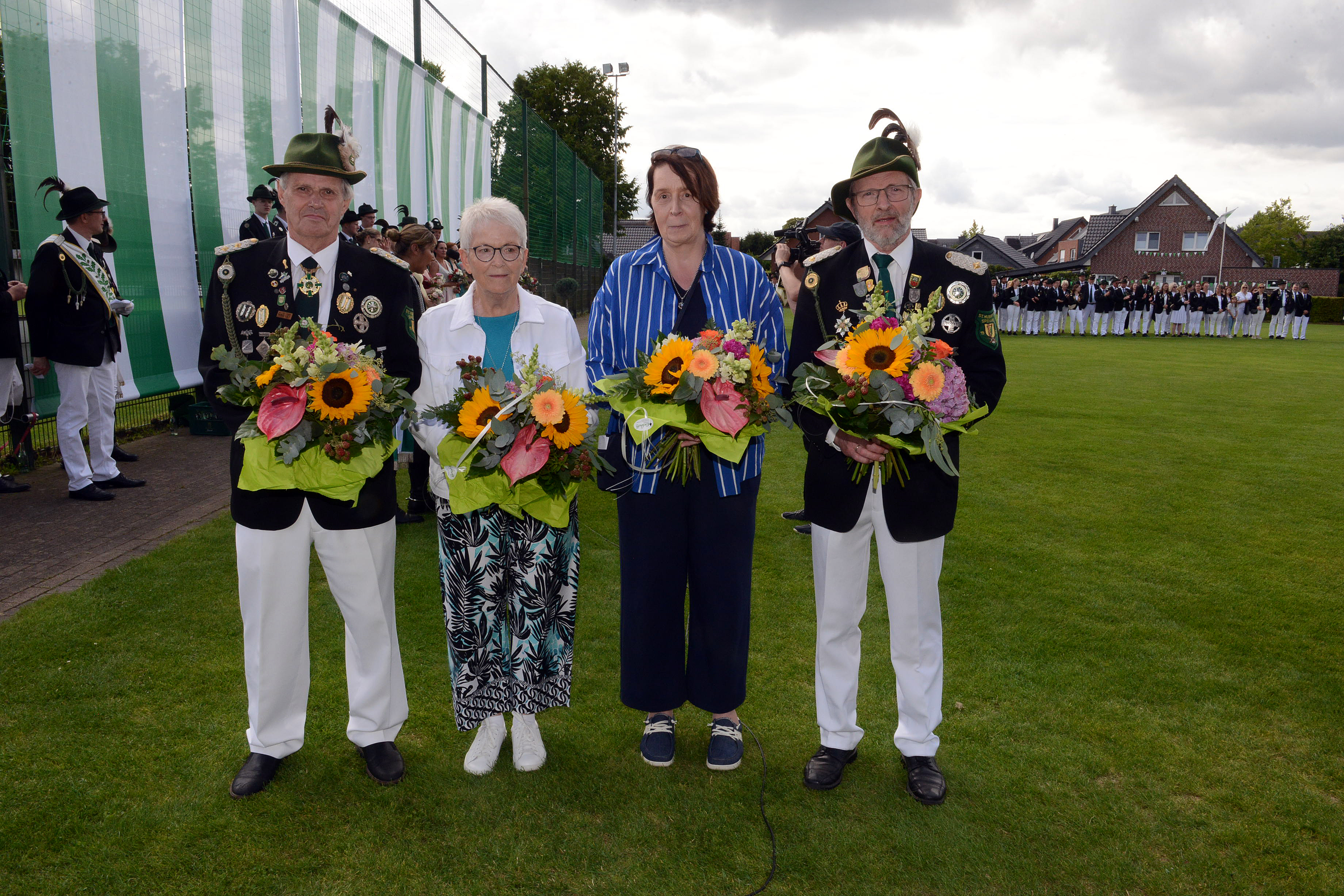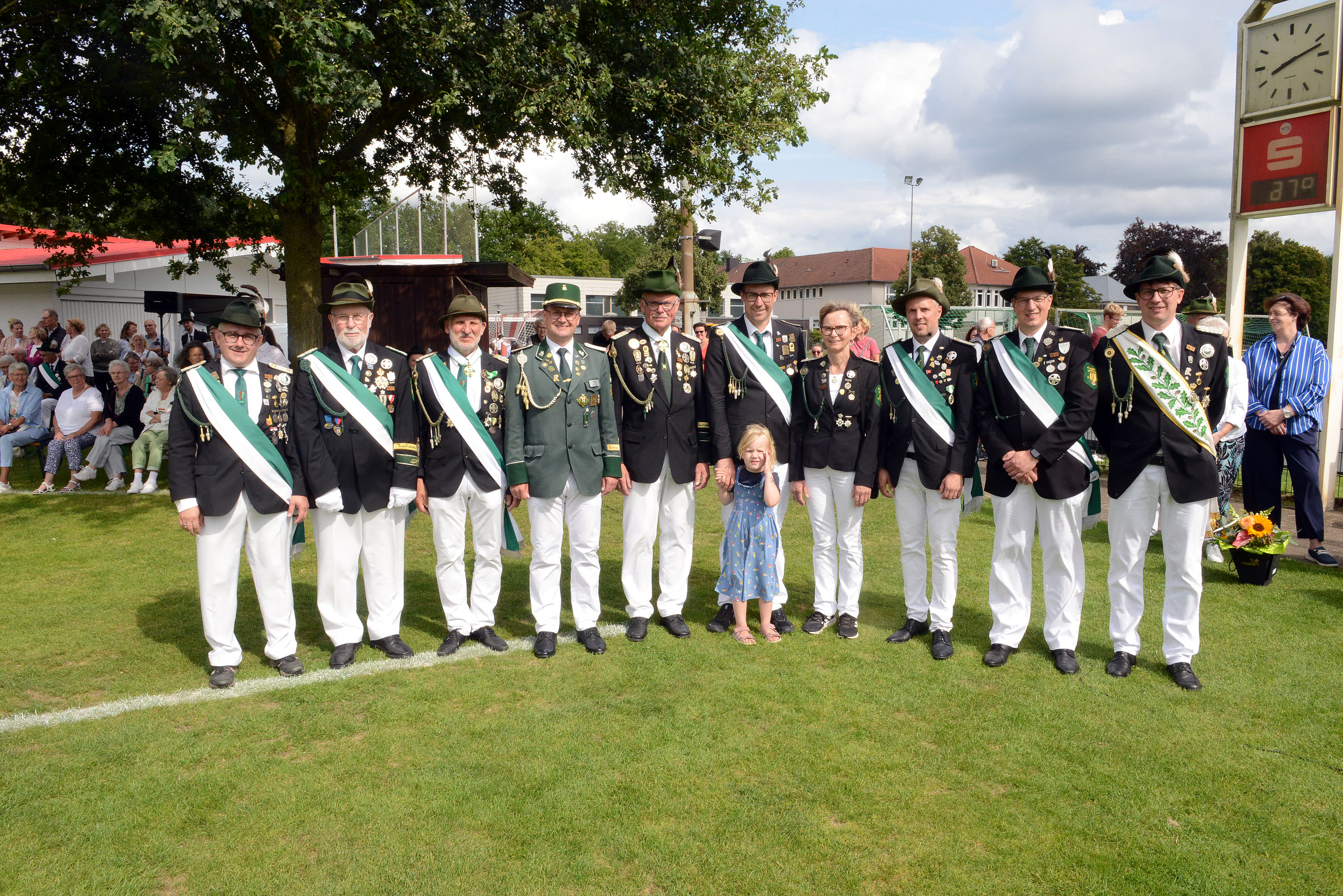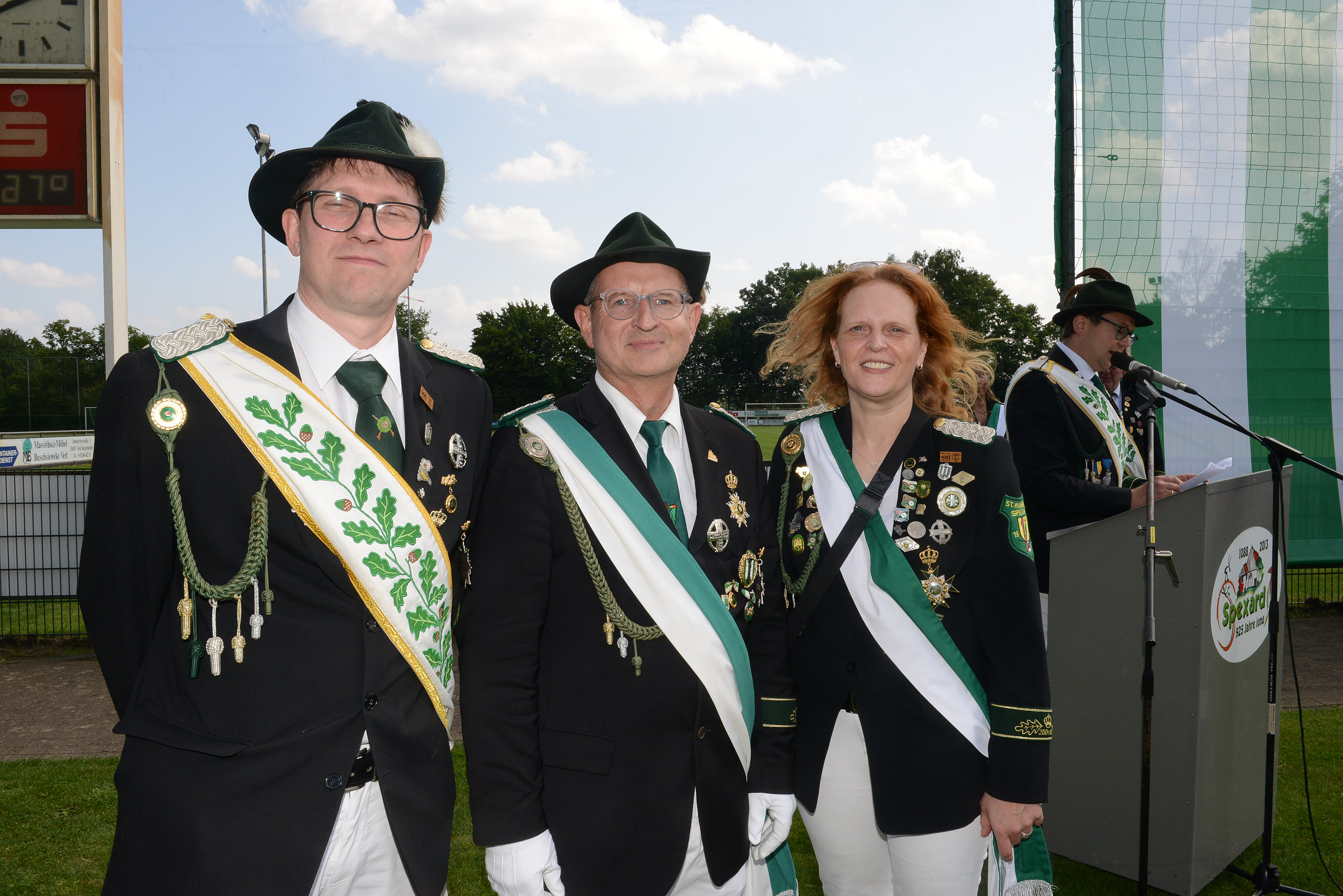 Der Sportplatz ist für den neuen Spexarder Schützenkönig Volker I. Stickling eigentlich sein zweites Wohnzimmer. Mit seiner Königin und Gattin Daniela I. durfte der Vorsitzende des Sportvereins auf seinem Fußballplatz die Parade abnehmen und die Throngesellschaft der Öffentlichkeit präsentieren. Mit schmucken Kleidern stellte sich auch der Jungschützenthron um die Regenten Phil Kahlert und Lea Wullenkord den Besuchern vor.