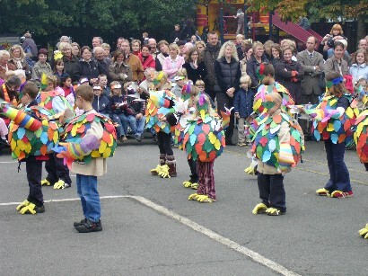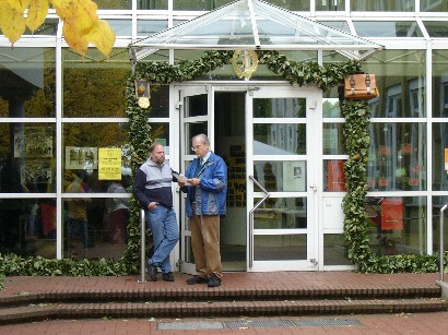 | Die Nachbarschaft der Grundschule hatte das Portal mit einem prächtigen Kranz aus Eichenlaub geschmückt. |