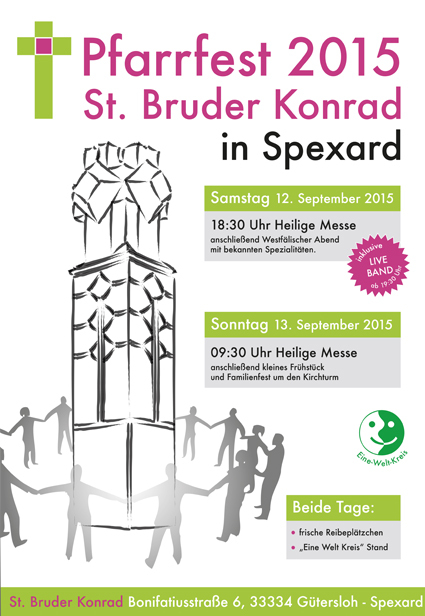 Die Pfarrgemeinde St. Bruder Konrad lädt für Samstag, 12. September, zum „Westfälischen Abend“ ein. Nach der Vorabendmesse um 18.30 Uhr – begleitet durch die Band „Saitensprung“ – erwartet die Gäste außer westfälischen Spezialitäten auch Reibeplätzchen und Livemusik mit dem Duo „Robertos Musikexpress“ aus Leverkusen. Am Sonntag, 13. September, findet ab 9.30 Uhr das Hochamt statt. Anschließend lädt der Eine-Welt-Kreis zum kleinen Frühstück ins Pfarrheim ein.