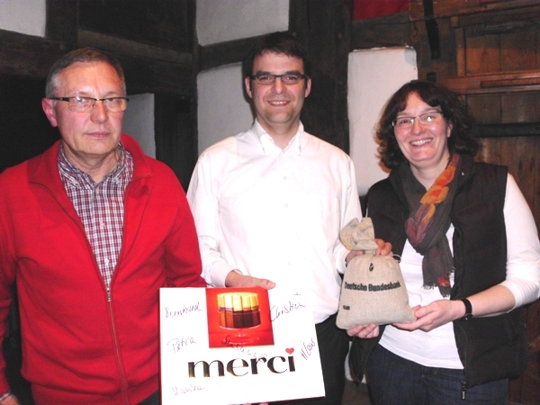 | Frank Busche (Mitte) übergibt die Kasse an Michaela Koch(rechts). Vorsitzender Bernhard Jakobtorweihen dankt Busche für seine Arbeit. |
