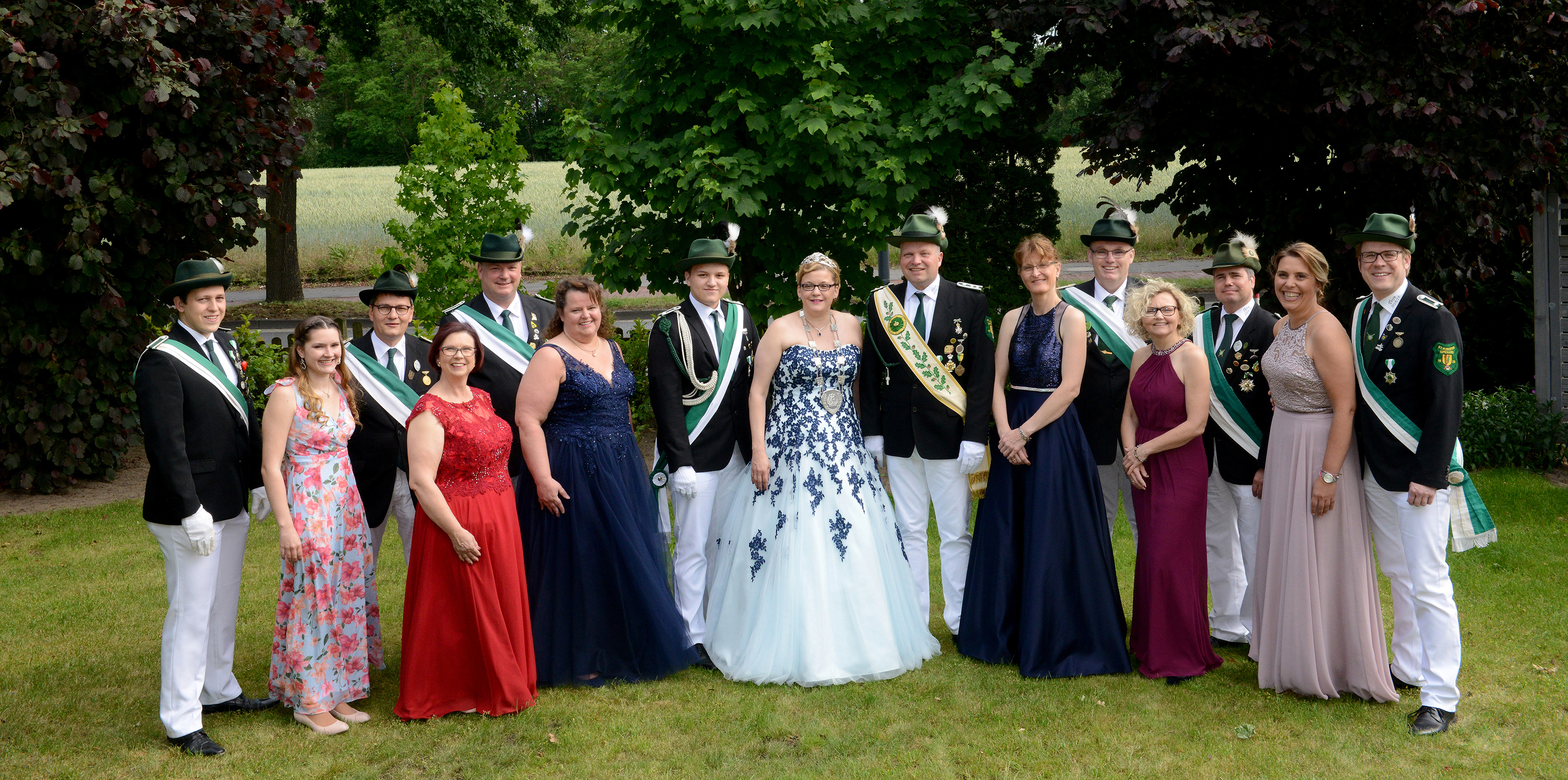 Der Spexarder Schützenthron von links: Johannes Vollmann und Nina Eickhoff. Frank Eickhoff und Ursula Eickhoff, Thorsten und Petra Rüterbories, Adjutant Moritz Toppmöller, Königin Anja I Toppmöller, König Markus Toppmöller, Annette und Markus Schumacher, Ute und Martin Imping, Carmen Blöbaum und Dierk Mönks