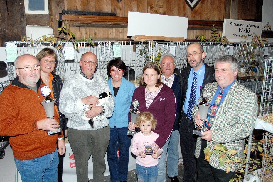 Die erfolgreichste Jungzüchterin war Nadine Hirschmann. Die Elfjährige wurde vom Kreisvorsitzenden Wolfgang Ewers (Rietberg) mit der Landesverbandsmedaille ausgezeichnet. Zusätzlich gewann die Schülerin den 1. Jugendpokal. Für seine gute Kaninchenzucht wurde Wolfgang Kowalle mit der Kreisverbandsmedaille belohnt. Der Rietberger stellte außerdem den besten Rammler und durfte sich über den Stadtehrenpreis von Bürgermeisterin und Schirmherrin Maria Unger freuen. Angeschlossen an der Schau hatten sich wie immer der Englische Schecken-Club und der Alaska-Club W 224. Rochus Gebauer, einer der Züchter der Englischen Schecken stellte den besten Rammler im Farbschlag Schwarz und Weiß. „Es war ein guter Jahrgang der schwer zu züchtenden Schecken. Meine Tiere haben gut abgeschnitten,“ freute sich Gebauer.