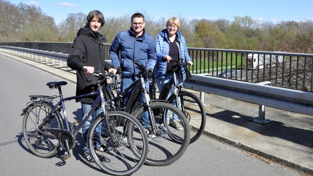 | Nils Wittenbrink, Niklas Reimer und Ingrid Hollenhorst (v. l.) vom CDU-Ortsverband Spexard fordern einen Radweg beim Neubau der Brücke „In der Worth“ über die A2. |