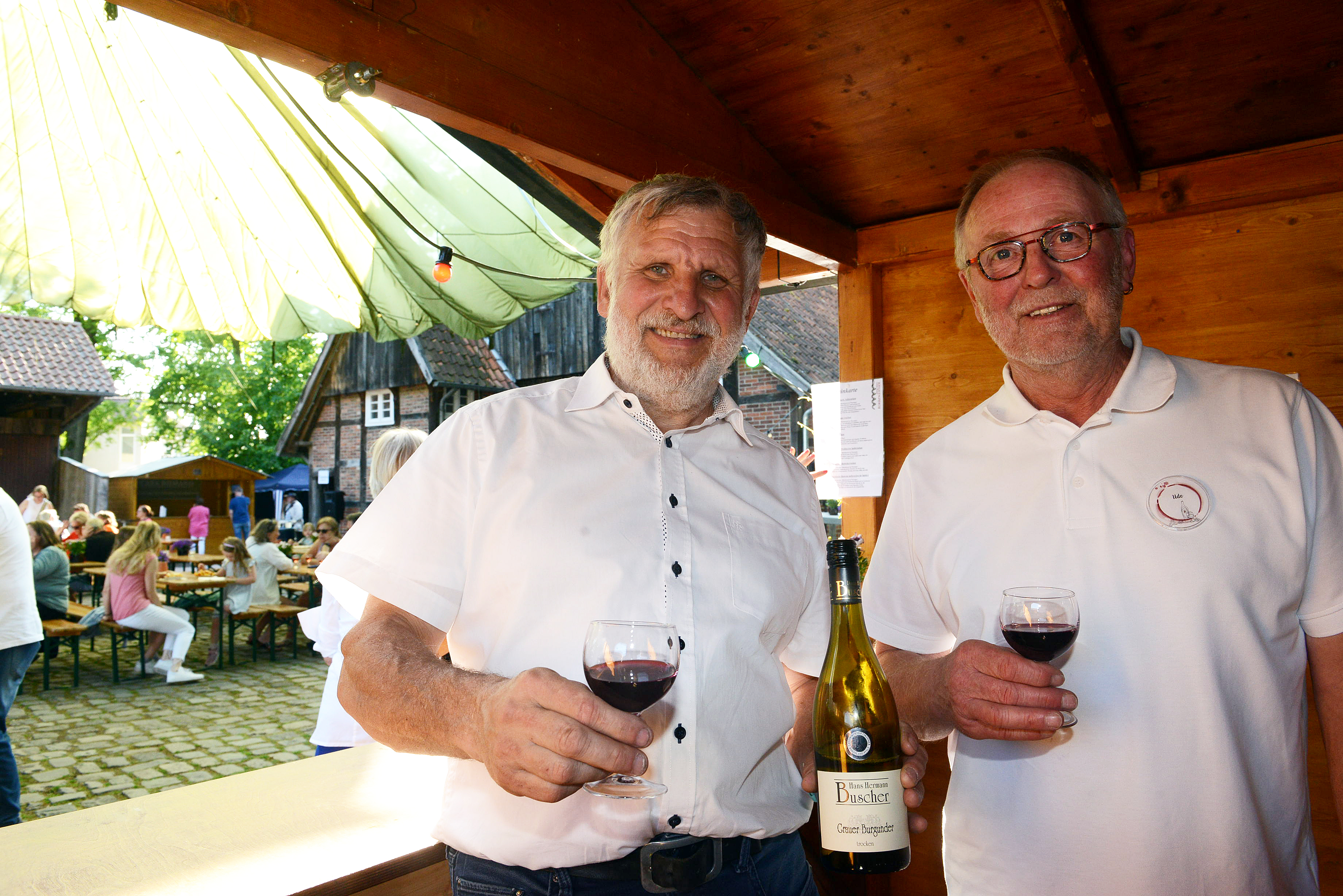Bereits beim ersten Weinmarkt in Spexard vor vier Jahren war Heike Haitisch mit den erlesenen Weinen vom Gut Machmer aus Bechtheim bei Worms mit von der Partie. „Der feinherbe Rose fand auch guten Absatz. Die Bioweine aus Rheinland-Pfalz sind echte Qualitätsprodukte und gut bewertet. Die Kenner stehen immer mehr auf diese Weine.“ Die Besucher bewerteten auch die portugiesischen Weine, die an zwei Verkaufshütten angeboten wurden, sehr gut und der Absatz war groß. „Am Samstag mussten wir noch einmal nachordern“, sagte Richard Proske, der mit Udo Pollmeier im Ausschank tätig war. Der Spexard ist mit dem Land der Seefahrer durch die Portugiesische Vereinigung sehr verbunden und die Gaumenspezialitäten wurden durch das Feinkostgeschäft Casa Romano aus Gütersloh gestillt. Mit Garnelen aus der Pfanne, Puddingtörtchen oder einer Tapas Platte konnte sich der Weinfestbesucher verköstigen. Den frischen Flammkuchen und Pommes frites kredenzte die Throngesellschaft der Spexarder Hubertusschützen um das Königspaar Günter und Irene Melzer in Eigenregie. Hinter dem Ofen war Reimund Schmolka der Chefkoch. Der Hofstaat hatte wegen der Corina-Pandemie von 2019 bis 2022 regiert und die Idee den Weinmarkt nach Spexard zu bringen. „Wir sind in diesem Jahr mit drei Dutzend ehrenamtlichen Helfern im Einsatz und ziehen ein positives Fazit“, resümierte Andreas Koch, bei dem die Fäden während der Vorbereitung und des Weinmarktes zusammenliefen. „Die Besucherzahlen haben mich überrascht und ist eine Bestätigung für unseren Aufwand. Das traumhafte Wetter hat uns in die Karten gespielt, weil es eine ideale Voraussetzung für ein gelungenes Fest ist.“ In den Hütten des Jugendfördervereins Spexard wurden die Weine und Speisen verkauft. Häppchen zum Wein wurden angeboten und für die Kinder stand eine Hüpfburg zur Verfügung. Unter einem ausgedienten Falschschirm der Bundeswehr entstand auf dem Vorplatz am Spexarder Bauernhaus eine kuschelige Atmosphäre und bis in den späten Abend kamen die Weinfreunde zu ihrem Vergnügen. Der ostwestfälische Biertrinker kam nur am Feiertag Christi Himmelfahrt auf seine Kosten, als die Veranstalter den Ausflügler zum Vatertag aus einer Bude frischen Gerstensaft anboten. „Der Tag ist noch ausbaufähig“, stellte Richard Proske fest. Der Überschuss der drei Tage wird wie in jedem Jahr auf das Baukonto für den neuen Schießstand des Sportschützenvereins überwiesen, der auf dem Festplatz entstehen soll.