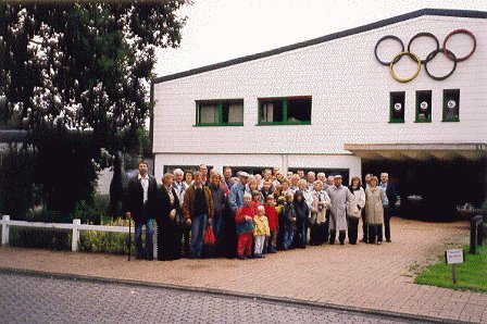 | Die Spexarder Heimatfreunde vor dem „Deutschen Olympischen Komitee der Reiterei“ in Warendorf. Links im Bild die Statue der Ausnahmestute Hallah, auf welcher Günther Winkler unzählige Siege erritt. |