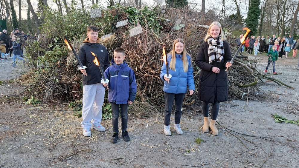 | Die Messdiener (v. l.) Richard, Robert und Constanze von Kurzynski, sowie Lina Niggenaber entzündeten das Osterfeuer am Spexarder Bauernhaus mit dem Licht der Osterkerze aus St. Bruder Konrad. |