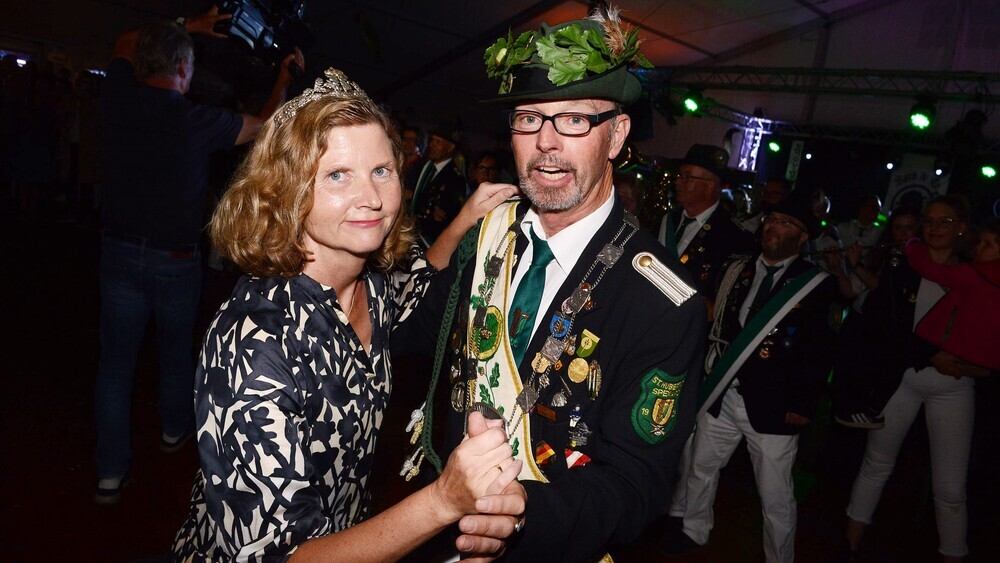 | Das neue Königspaar der Schützen in Spexard: Dirk und Astrid Fortenbacher tanzen bei der Proklamation im Festzelt. |