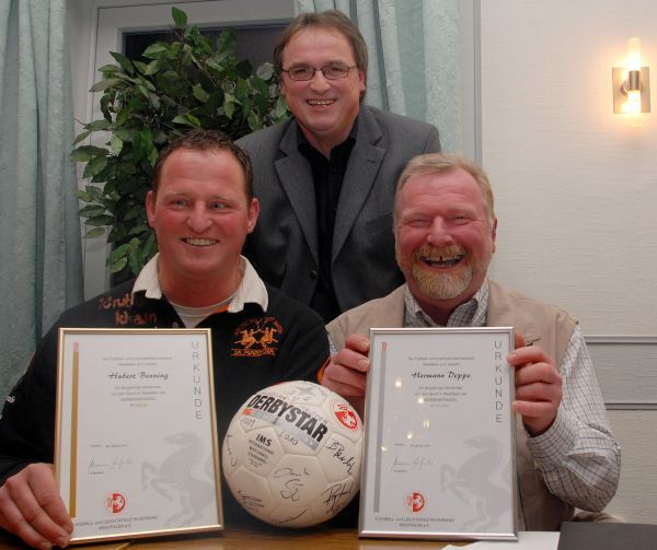 Die goldene Verdienstnadel des Westfälischen Fußballverbandes erhielt Hubert Benning. Der „Vater“ der Frauenabteilung der „Spechte“ ist seit 1976 im Verein und hat für die 1. Mannschaft gespielt. Als Trainer und Platzwart engagiert sich der 46-Jährige seit vielen Jahren. „Silber“ vergab der Kreisvorsitzende Reinhard Mainka an Hermann Deppe. Der 55-Jährige war Volleyballer und Torwart und ist seit 1989 der Betreuer des Sportheims und das Mädchen für Alles am Platz. Im Vorstand hat er mitgearbeitet und war Trainer der 2. Mannschaft.