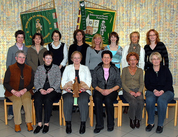 vorne: Edith Röhr, Walburga Feldhans, Königin der Königinnen Irmgard Schulte-Lindhorst, Elisabeth Büscher, Inge Allmandinger, Magdalene Willmann, hinten: Ulrike Westhoff, Karin Stüker, Maria Kötter, amtierende Königin Marion Steinkemper, Rita Leimann, Anja Kahlert, Renate de Carnèe, Claudia Hemken (v.l.)