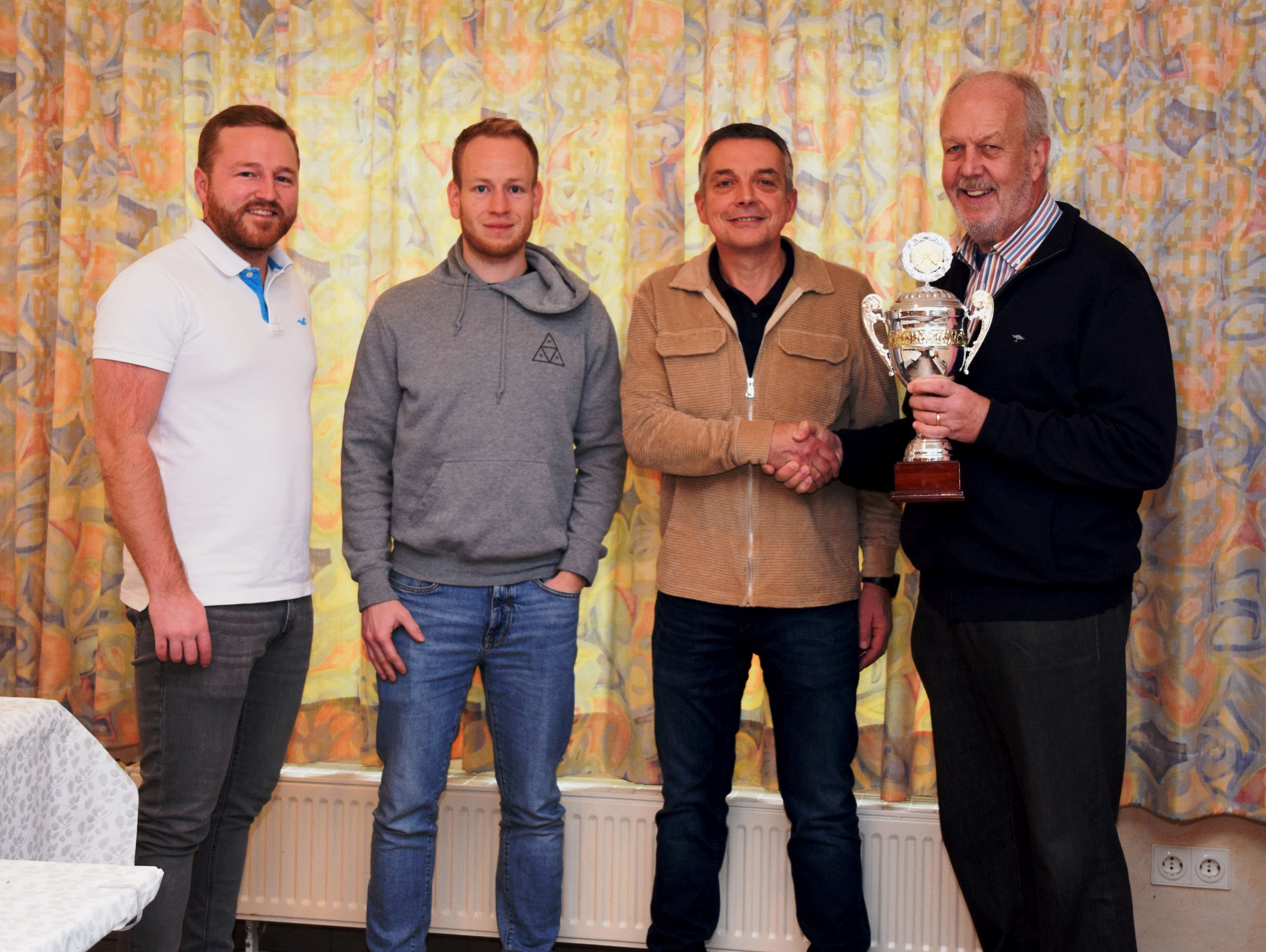 Die Siegermannschaft. v.l. Alexander Nolting , Marvin Bellmann , Volker Stickling. Es gratuliert Alfons Hollenhorst als Pokalspender