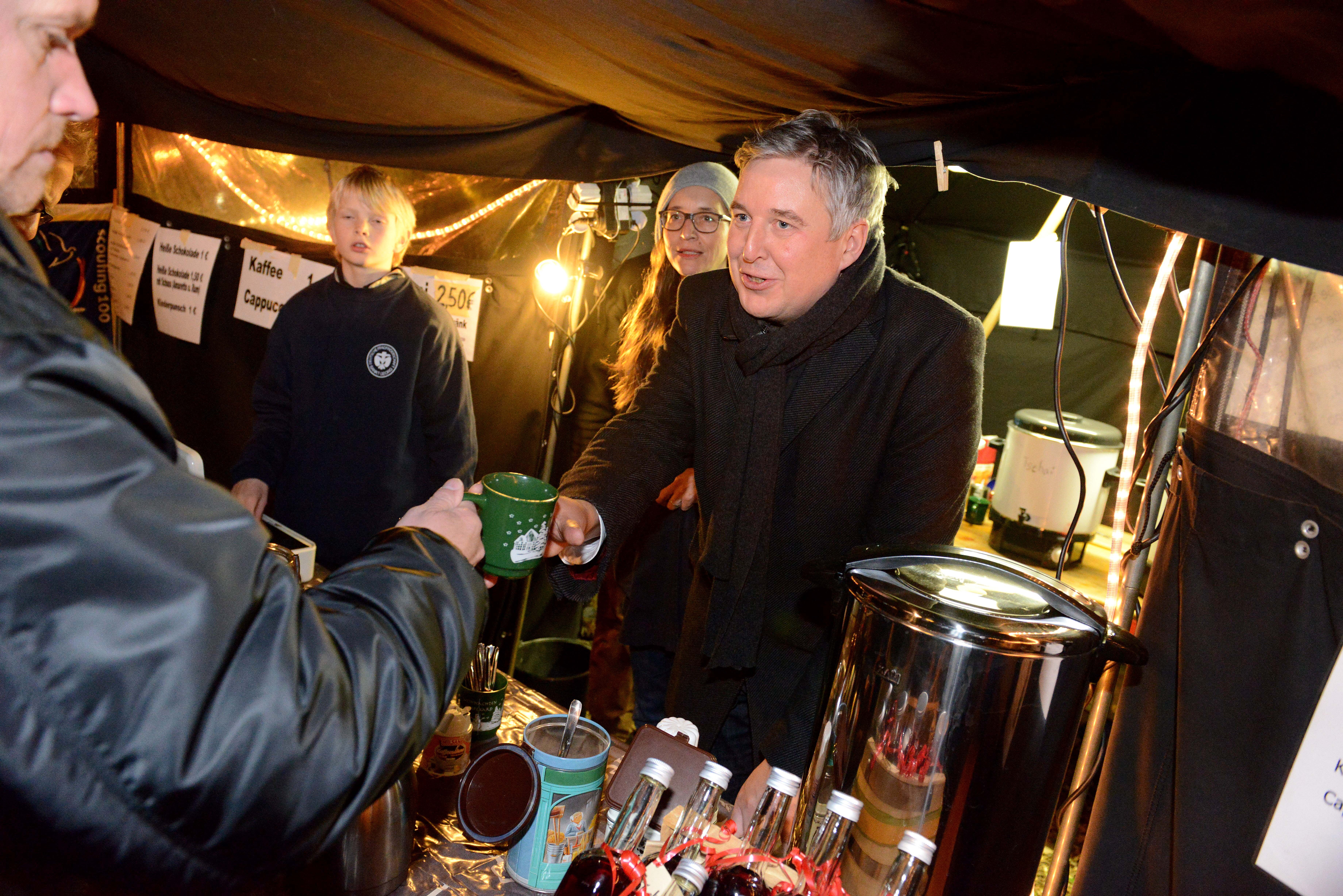 | Bürgermeister Henning Schulz verkaufte auf dem Spexarder Weihnachtsmarkt im Zelt der Pfadfinder das beliebte Heißgetränk "Tschai". |