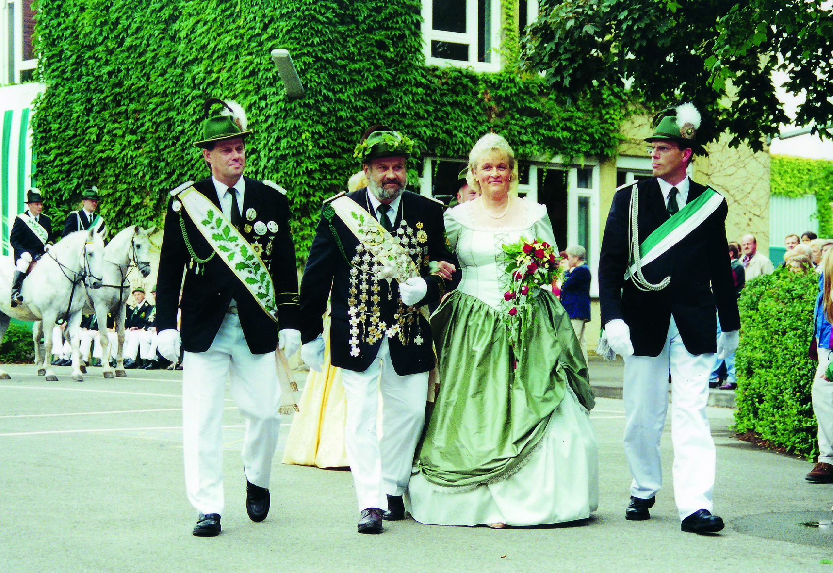 Vor 25 Jahren regierten Josef Cordfulland und Magdalene Willmann. Links Brudermeister Franz Spexard. Rechts der Thronadjutant Manfred Preuß.