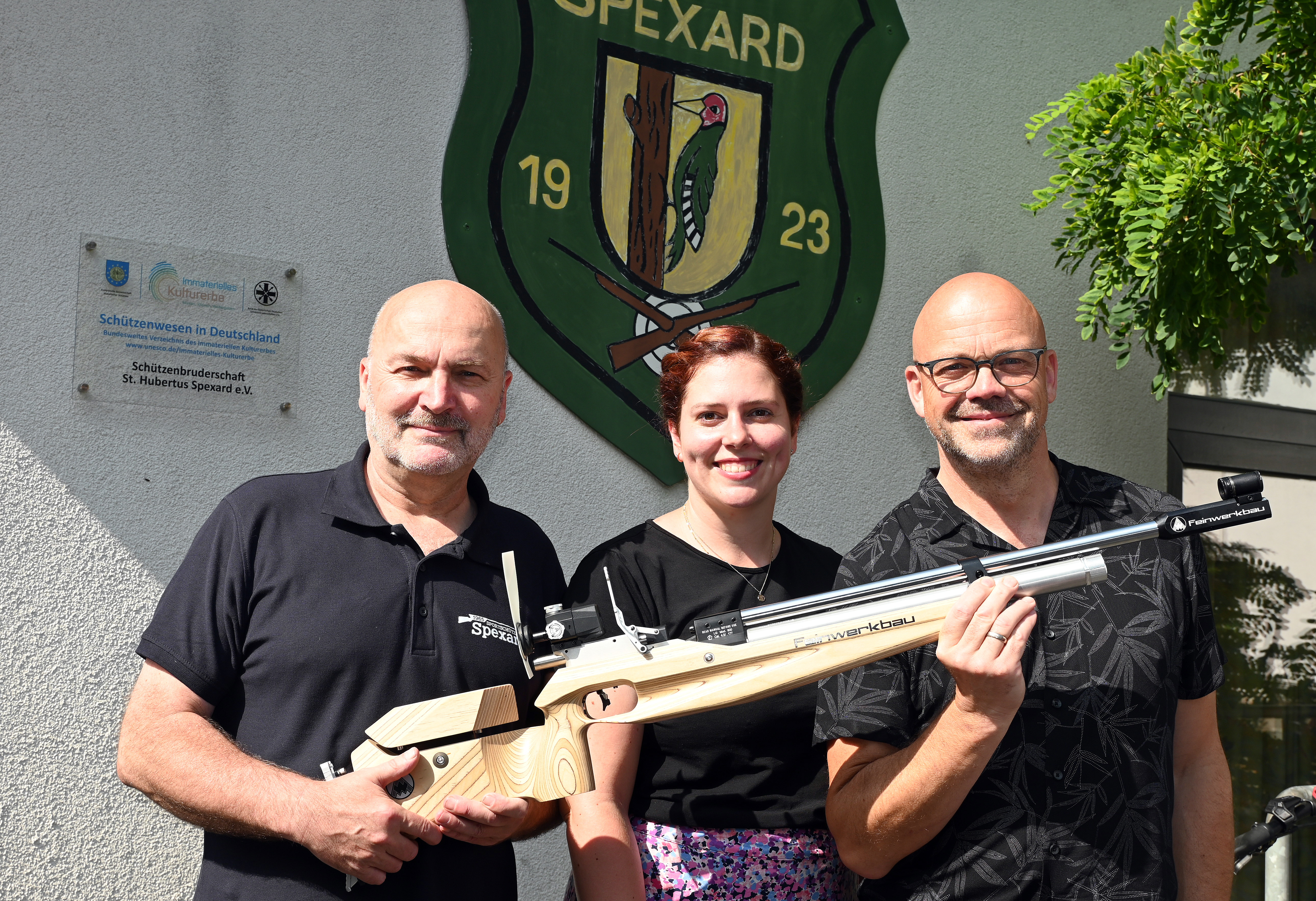Die Sportschützen Ralf Jakobsmeier (v.l.), Christina Kolkmann und Ralf Isenbort laden zum 100-Schuss-Schießen ein.