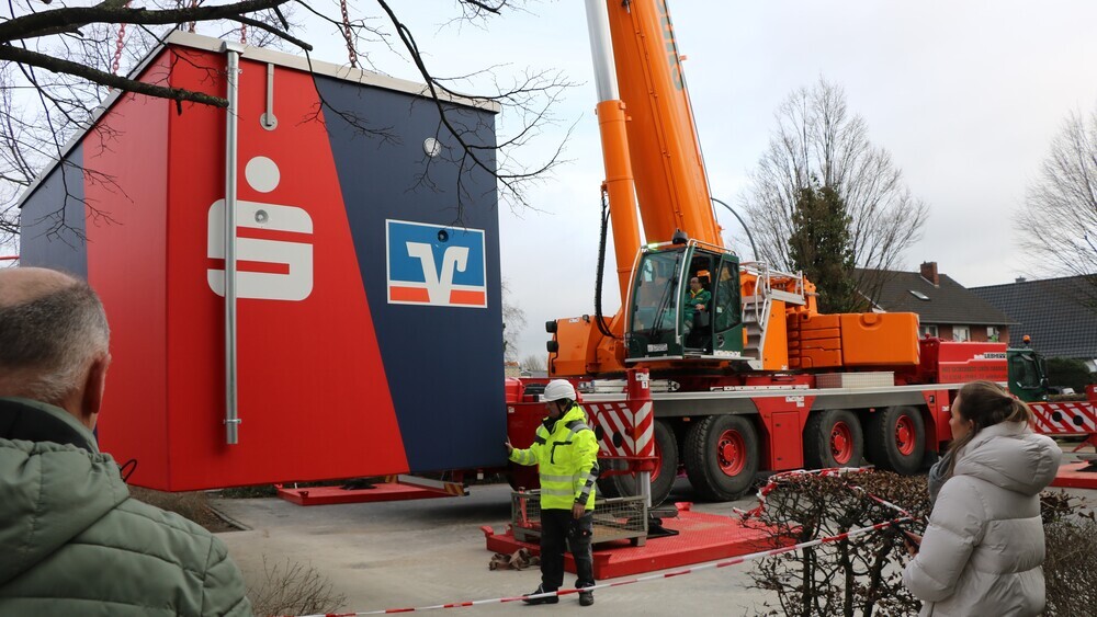Heftige Explosionen haben in der Nacht zum 27. Juni 2023 die Anwohner des Hüttenbrinks aus dem Schlaf gerissen. In der Sparkassen-Filiale hatten Kriminelle die Geldautomaten gesprengt. Seitdem mussten sich die Kunden im Ortsteil Spexard auf anderen Wegen mit Bargeld versorgen. Das ändert sich nun. Am 25. Januar rückte die Rheda-Wiedenbrücker Firma Peterburs mit Lkws und einem großen Kran an, um einen 32 Tonnen schweren Stahlbeton-Container auf dem Parkplatz der früheren Bankfiliale zu platzieren. „Dieser beheimatet künftig unser SB-Foyer“, berichtet Matthias Trepper, Sprecher der Sparkasse Gütersloh-Rietberg-Versmold. Die Inbetriebnahme ist für den 21. Februar geplant. Es müssen noch einige technische Dinge vorbereitet werden (Anschlüsse, Installationen, Reinigung), um die Bargeldversorgung im Ortsteil sicherstellen zu können.