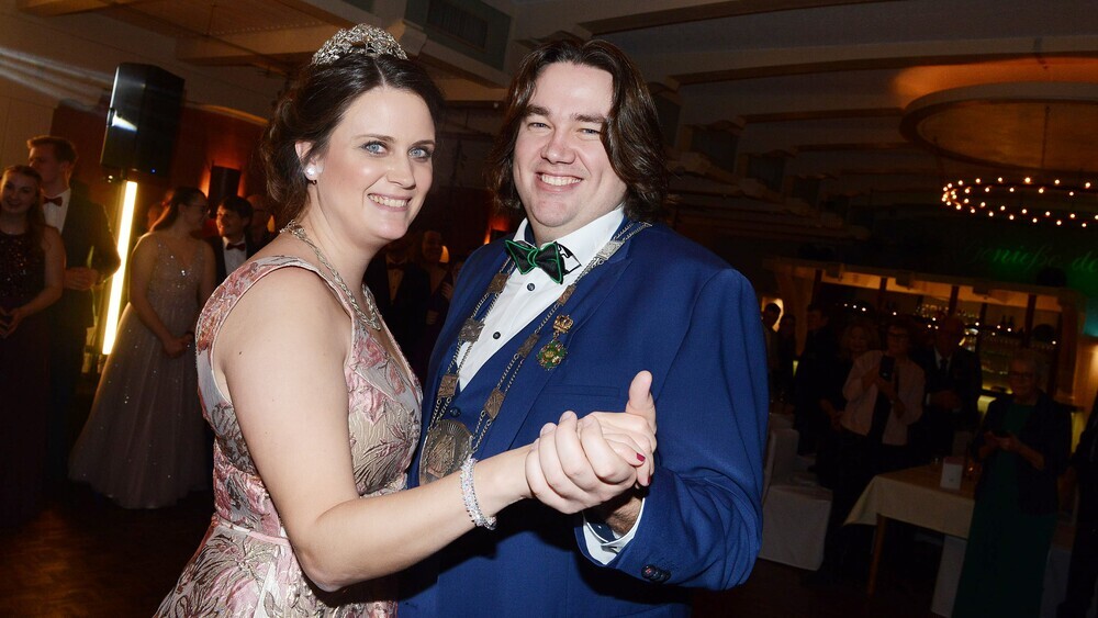 | Das Spexarder Königspaar Theresa und Malte Westerbarkey eröffnete den Tanz beim Winterball der Hubertusschützen. |