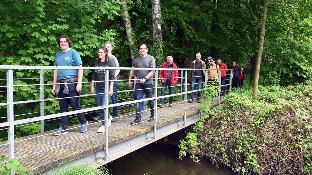 | Nach einer Untersuchung der Grenze zu Lintel überquerten die Teilnehmer den Ölbach über die Brücke am Ravensberger Weg. |