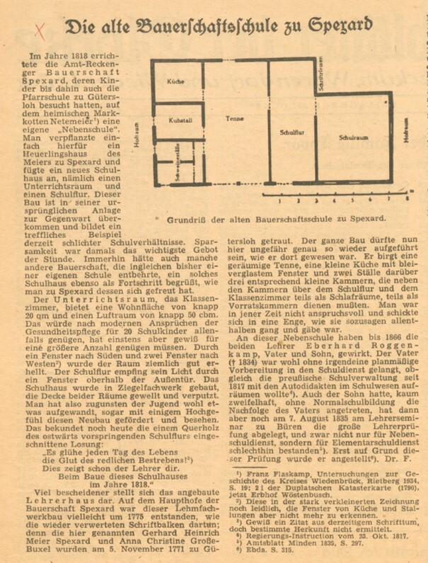 Die Kinder aus dem westlichen Teil der Bauerschaft Spexard und aus Kattenstroth gingen dort zur Schule. Die Kinder aus dem östlichen Teil Spexards besuchten die Schulten-Schule. Dieses Schulhaus wurde am Anfang des 19. Jahrhunderts auf dem Hof des Bauern Schulte auf’m Reck errichtet und 1873 abgerissen.