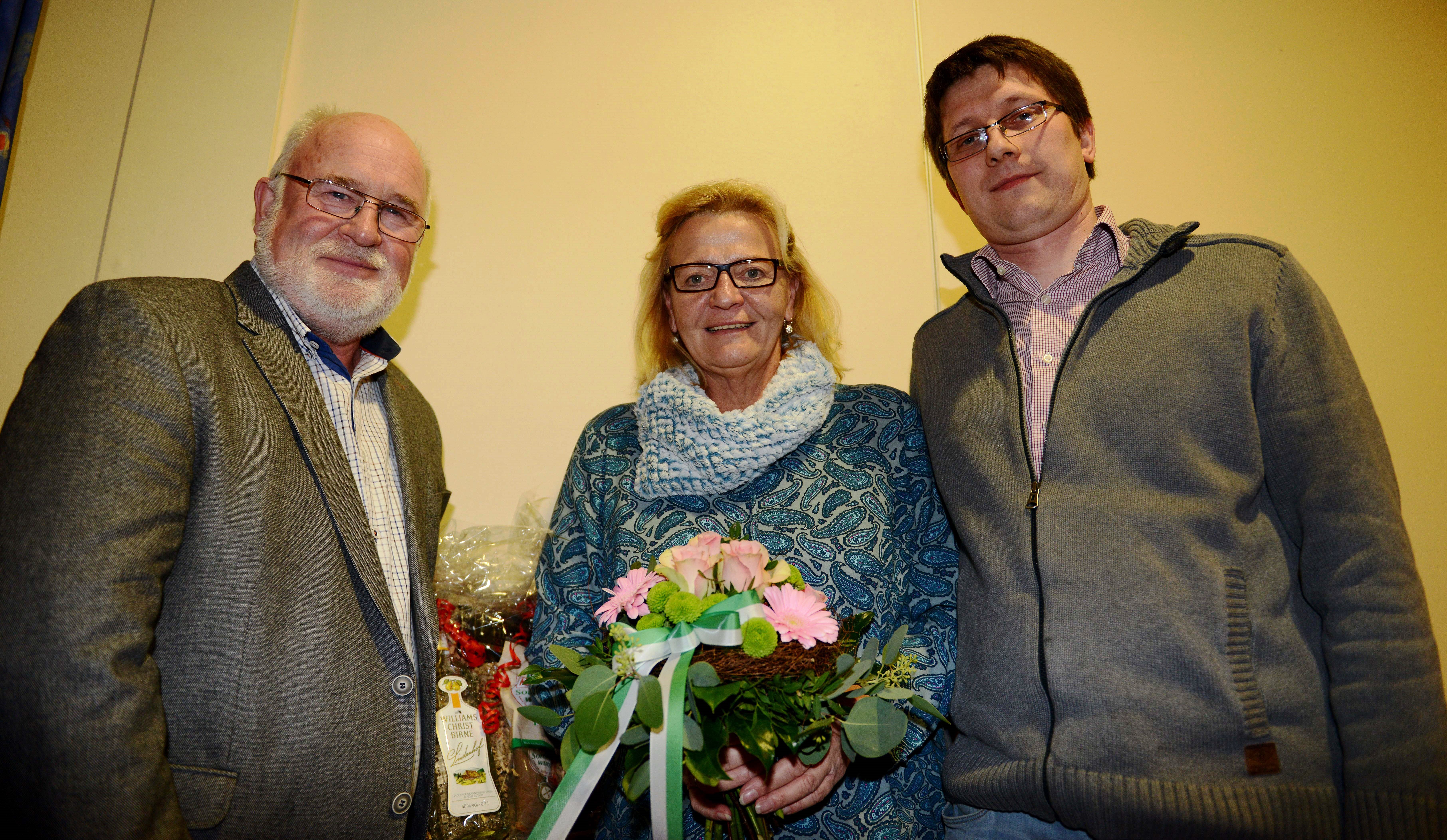 | Der Brudermeister Maik Hollenhorst (rechts) bedankte sich beim Bezirkskönigspaar Burkhard Willmann und Karola Cordulland für ihren Einsatz. |