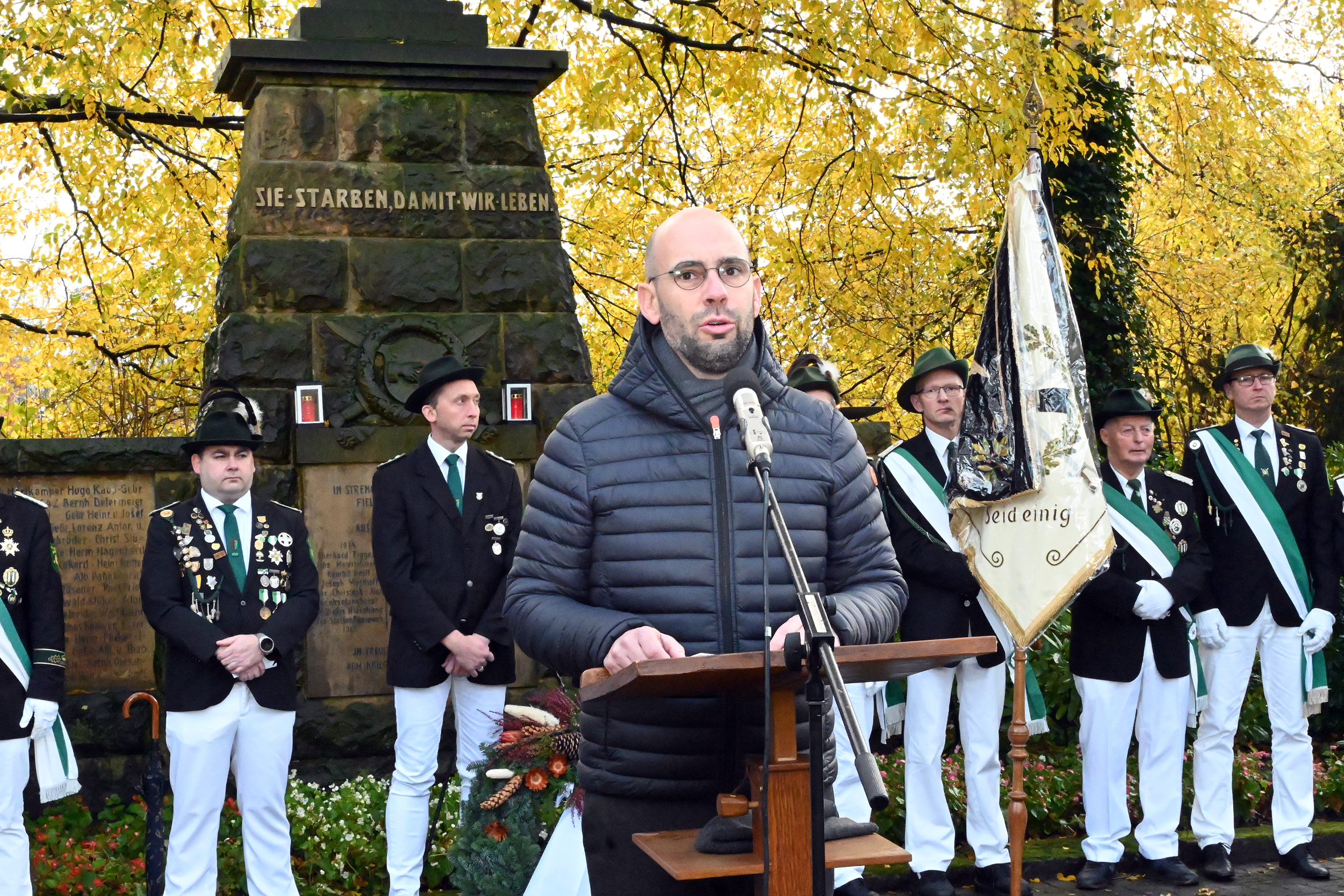 Die Gedenkstunde zum Volkstrauertag am Ehrenmal in Spexard stand in diesem Jahr im Zeichen der aktuellen Kriege auf der Welt. In seiner Ansprache verurteile Pfarrer Torsten Roland die kriegerischen Auseinandersetzungen und wünscht sich Frieden. „Wir müssen die Botschaft des Volkstrauertages in die Welt tragen und die Hände nicht in den Schoss legen. Die Kriege werden verdrängt und sind zur Normalität geworden“, rief der Leiter des Pastoralen Raums Gütersloh auf die Feindseligkeiten zu beenden. „Die Kinder in der Welt haben einen Anspruch auf eine Zukunft ohne Krieg und jeder von uns kann seinen Beitrag zum Frieden leisten.“ Pfarrer Roland erinnerte auch an die Toten der beiden Weltkriege und das Gedenken daran an Tagen wie dem Volkstrauertag. „Die Vergangenheit lässt sich nicht vergessen und wir müssen uns erinnern lassen.“ In dem vor der Feierstunde am Volkstrauertag vorausgegangenen Gottesdienst in der Bruder-Konrad-Kirche war Torsten Roland in seiner Predigt auf den letzten Sonntag im Kirchenjahr eingegangen, der am Totensonntag mit dem Hochfest Christkönig begangen wird. Nach dem dunklen November hofft Roland dann mit dem Beginn der Adventszeit und dem Erinnern an die Geburt von Jesus Christus an Weihnachten auf bessere Zeiten in der Welt und das den Menschen ein Licht aufgeht.