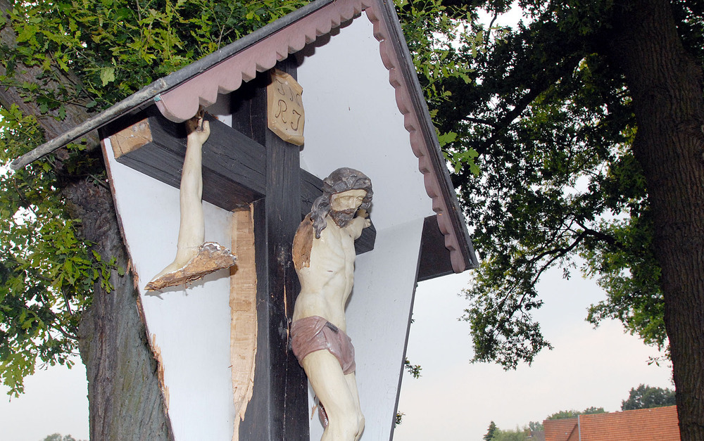 Nicht zum ersten Mal schlug der Blitz ein an dem mehr als 120 Jahre alten Wegekreuz, das ursprünglich zum Hof Beckmann gehörte. Die Familie wanderte 1890 nach Amerika aus und verkaufte den Hof an den Nachbar Roggenkamp. Ab 1930 waren die Schwiegereltern von Maria Peitz für das Kreuz verantwortlich. „Es muss fast 20 Jahre her sein, als ein Unwetter das ganze Kreuz mit dem Korpus zu Boden riss“, erinnert sich Maria Peitz. „Der Jesus hat dann, gut eingepackt, ein paar Jahre bei uns auf dem Heubalken gelegen.“ Auf Initiative von Günter Feuerborn wurde das Kreuz dann wieder hergerichtet und unter Eichen, die am Wegrand stehen, aufgestellt. Vielleicht hätte es dort nie aufgerichtet werden sollen, denn in einem alten Sprichwort heißt es: „Vor Eichen sollst du bei Blitz und Donner weichen“.