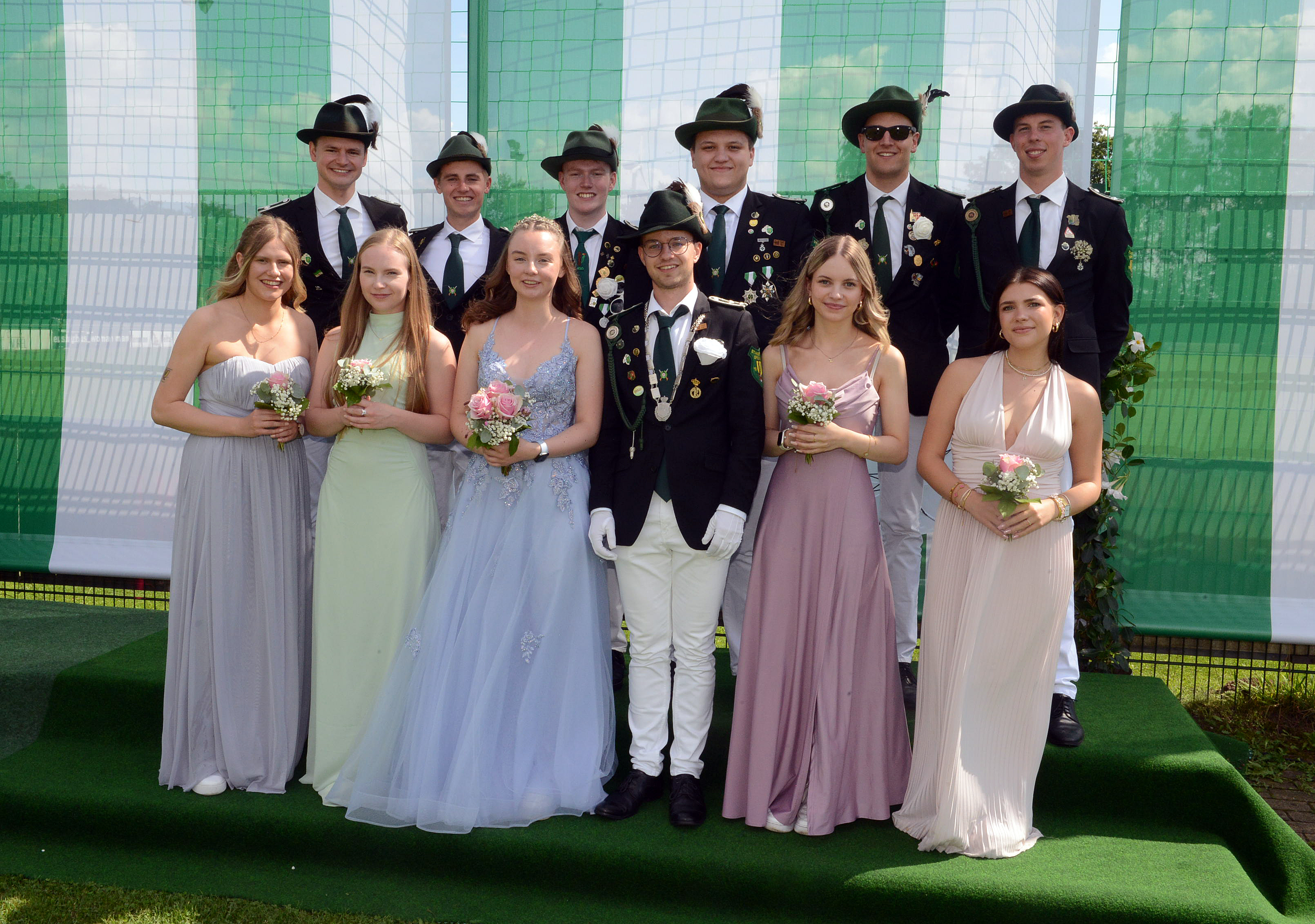 Den Jungschützenthron bilden: Madlen Wullenkord und Stefen Thiesbrummel (v.l.), Hannah Ostlinning und Alexander Peitz, Königin Hannah Fortenbacher, Adjutant Felix Knies, König Lennard Stüker, Jungschützenmeister Moritz Toppmöller, Lilli Nikolasevic und Nils Meiertoberens und Jona Johannhörster und Lilly Schüler.