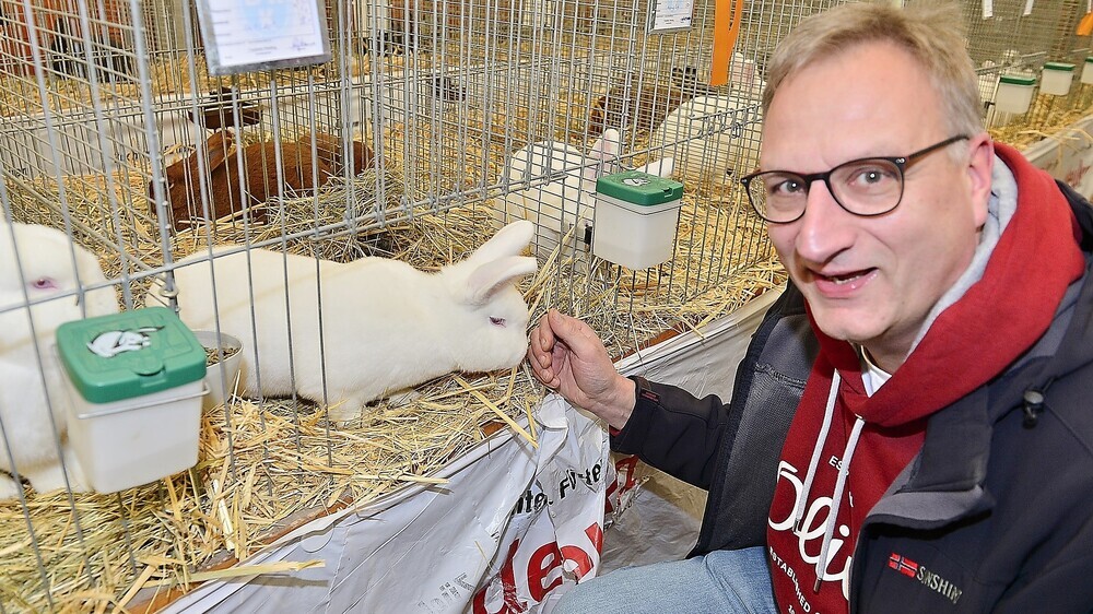| Heino Hanhörster versorgt seine weißen Neuseeländer-Kaninchen mit Futter. |