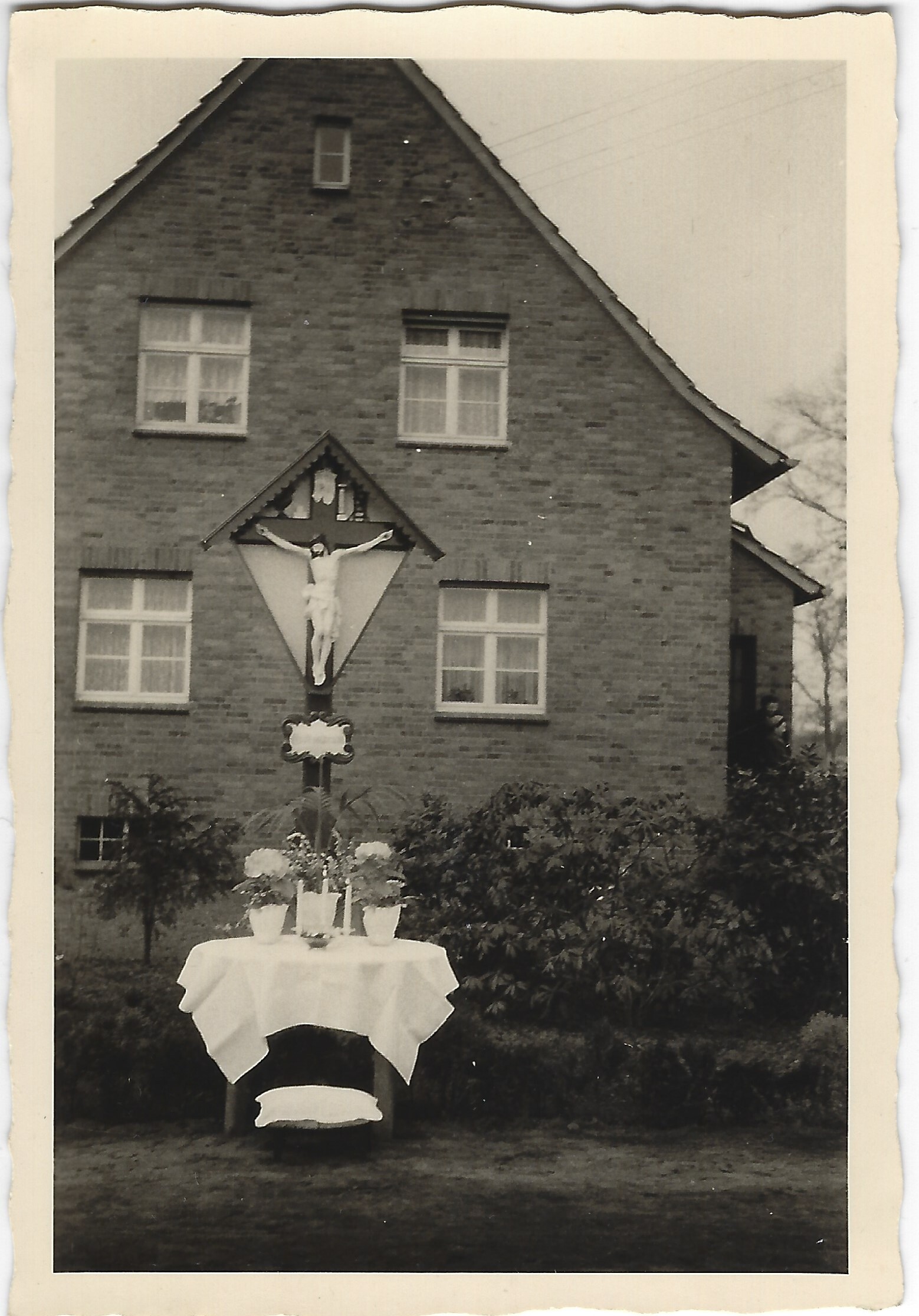 „Am hl. Karfreitag des Kriegsjahres 1915 hat die Familie Colon Stüker von hier ein schönes Kreuz errichten und durch den Herr Vikar Schulte einweihen lassen. Die Nachbarn wohnten der Einweihung andächtig bei. Das Kreuz, beschattet von Tannen, steht am Wege zw. Colon Stüker und Colon Kosfeld.“