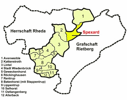 Dieses Schaubild nach der Karte von 1790 verdeutlicht die eingeengte Lage der kleinen Exklave des Bistums Osnabrück zwischen der Herrschaft Rheda und der Grafschaft Rietberg. Farblich abgesetzt das Amt Reckenberg mit den Bauerschaften und der Stadt Wiedenbrück. Deutlich zu erkennen ist der eingeschnürte nord-östliche Teil der Bauerschaft Spexard.