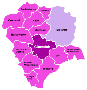 Die 13 Städte und Gemeinden des Kreises Gütersloh mit der benachbarten kreisfreien Stadt Bielefeld.