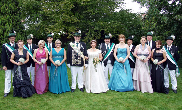 Thron Spexard: Michael und Dunja Delker, Ute und Martin Imping, Anna Reker und Carsten Imping, Königspaar Markus Schumacher und Ursula Eickhoff, Adjutant Michael Wulfhorst, Annette Rübbelke und Frank Eickhoff, Anja und Markus Toppmöller, Karin und Friedhelm Stüker (v.l.)